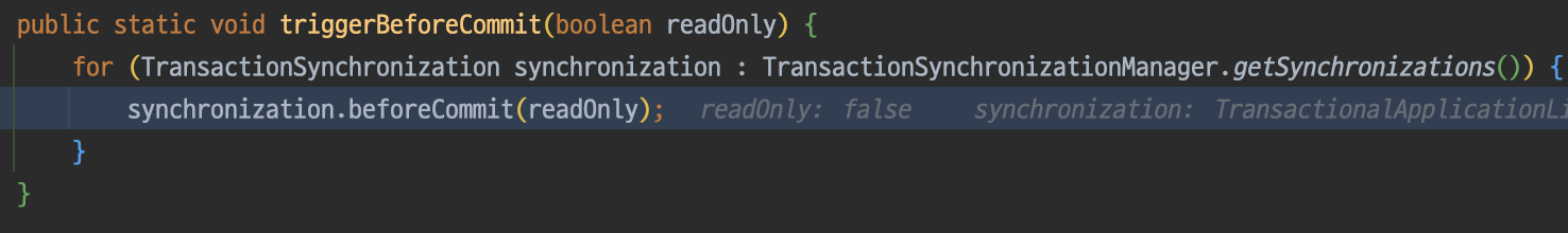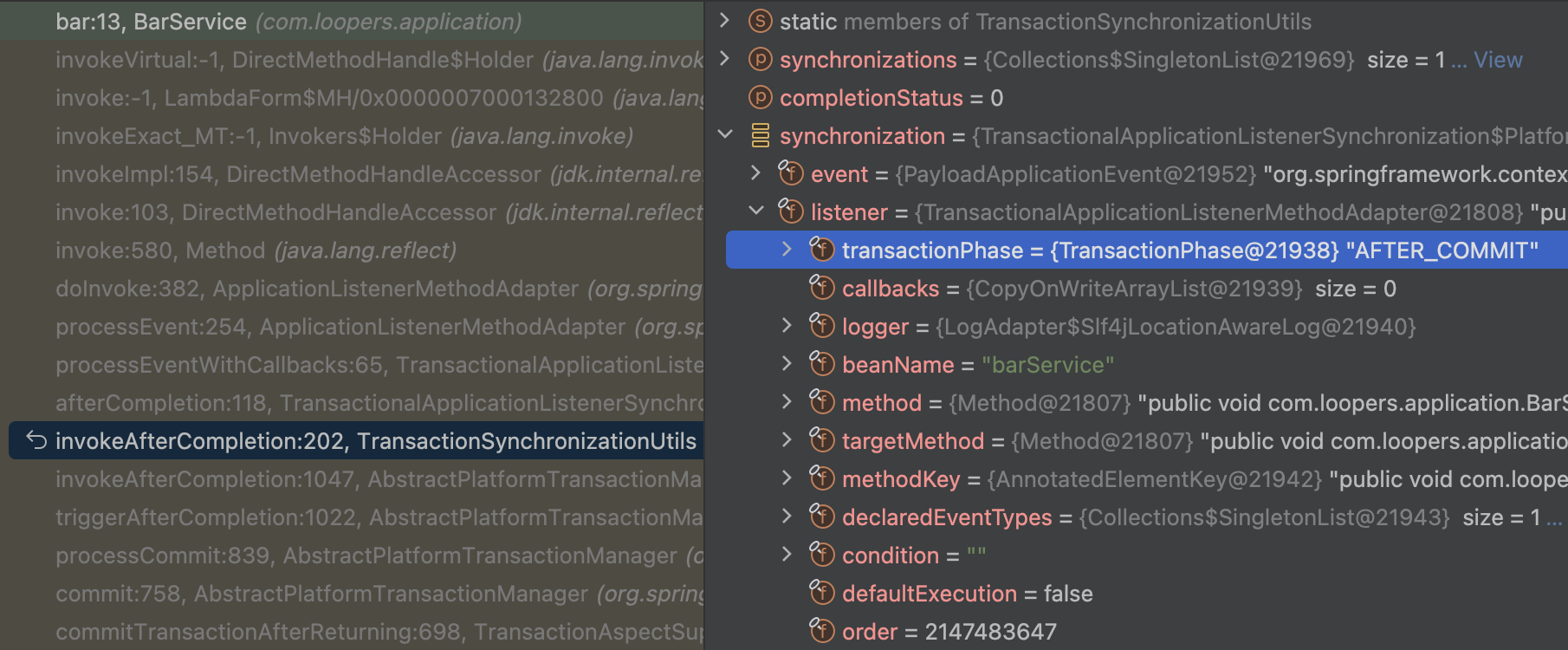이벤트 메서드에 디버그 포인트를 찍고 보면 그 비밀을 알 수 있다. TransactionSynchronizationUtils의 invokeAfterCompletion를 통해 이벤트가 호출 된 것을 알 수 있다.