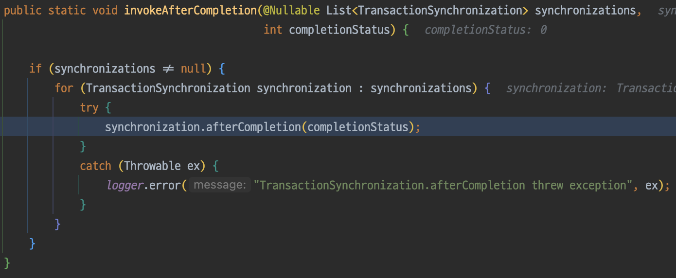invokeAfterCompletion메서드 자체가 @Transactional로 인해 만들어지는 프록시의 트랜잭션 커밋 이후에 호출되기 때문에 순서가 절차적이지 않았다.