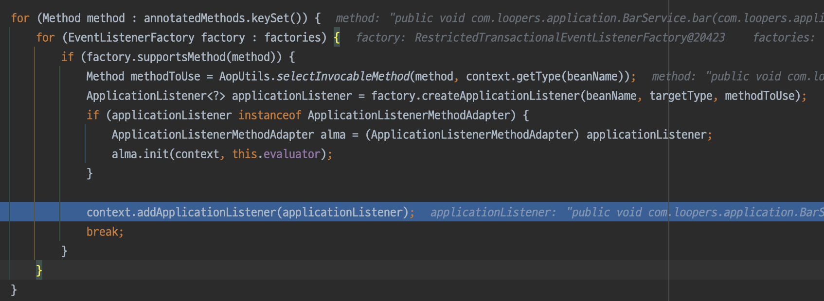 정답은 EventListenerMethodProcessor에 있다. 스프링 빈을 모두 생성하면 EventListenerMethodProcessor는 BeanFactory에서 @EventListener애너테이션이 붙은 메서드를 가져와 적절한 ApplicationListener에 등록해 준다.